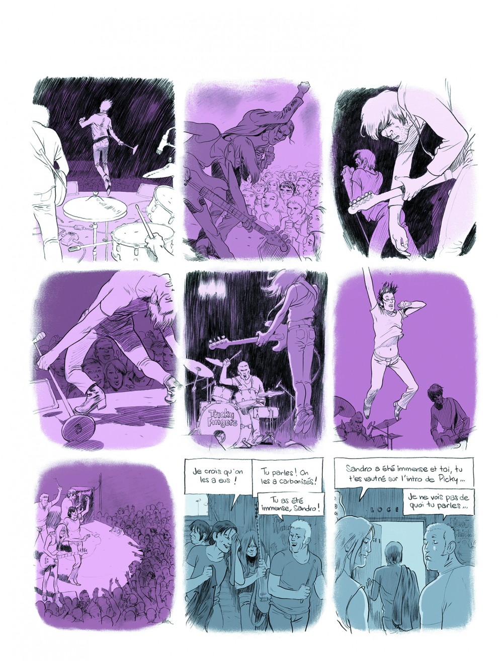 Résumé : Les Tricky Fingers (allusion certaine à l’album des Pierres qui Roulent !) sont donc quatre jeunes gens dans le vent, Sandro, JB, Franck et Yvan plein d’ambition, vivant pour le rock. Ils sont alors en pleine ascension et ont déjà quelques aficionados quand éclate une bagarre, juste avant un grand show musical (où l’on croise Beck). Bagarre qui va scléroser et faire éclater le groupe.