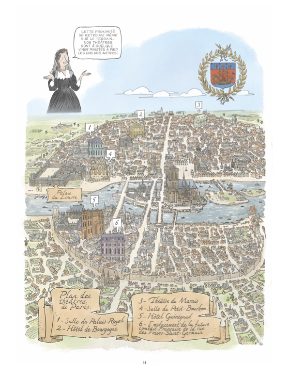 Le découpage séduit dans sa manière d’alterner dialogues – en délaissant le gaufrier pour une mise en scène plus théâtres – et scènes d’exposition, avec des dessins plus détaillés : retenons par exemple cette vue de Paris pour présenter les différents théâtres de la capitale. Le récit est plein de second degré et de références qui font sourire. Le dessin de Virginie Augustin, soigneux dans la représentation des décors, emprunte volontiers à la caricature pour représenter ses personnages.