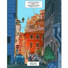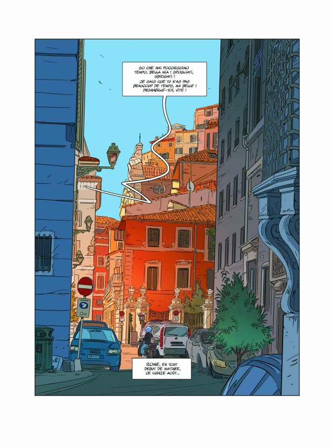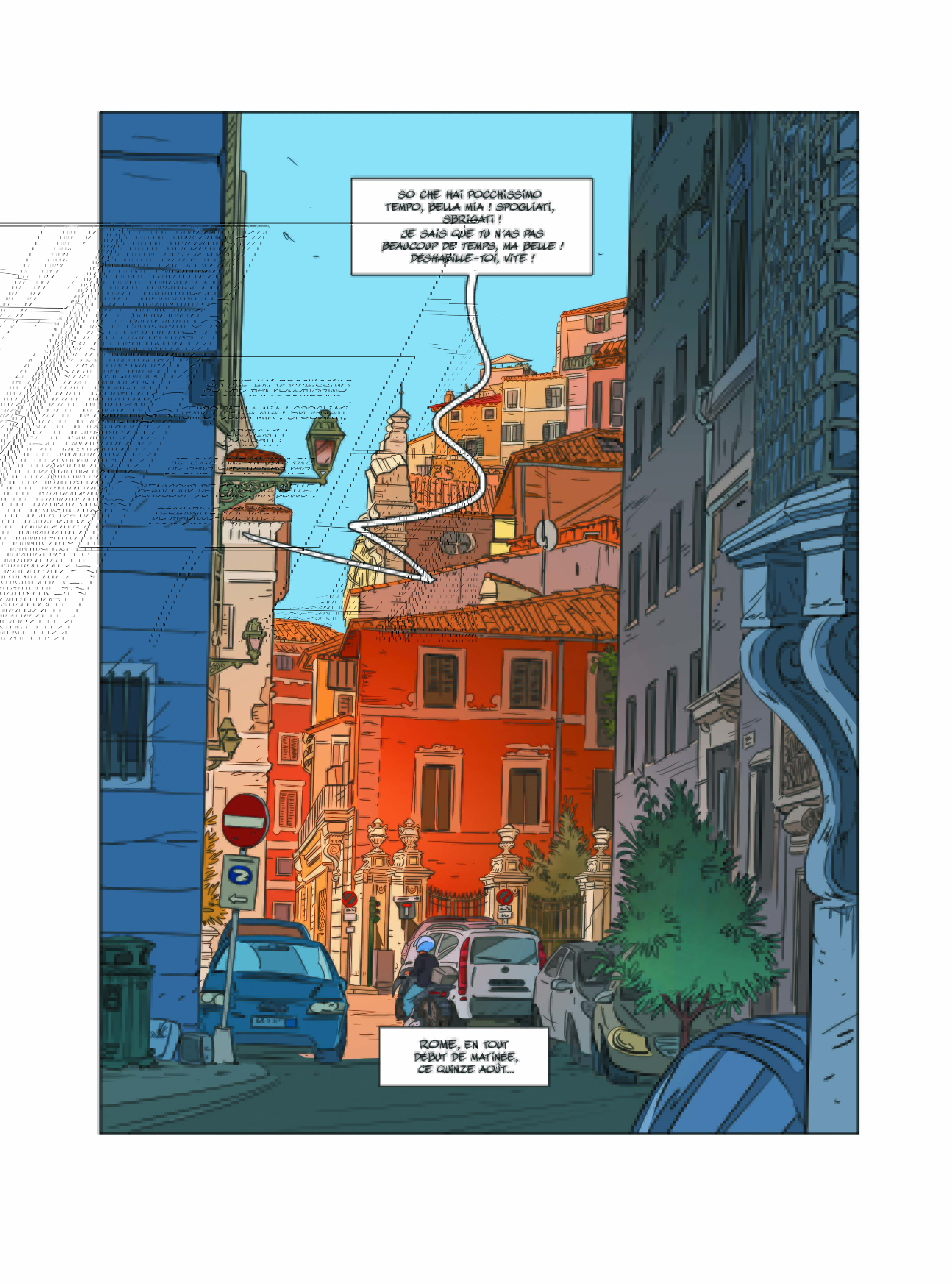 Les décors réalistes mais en même temps tracé d’une main légère, prennent du poids grâce aux couleurs. Delphine, qui a mis en couleurs ce nouvel opus, nous offre une lumière romaine qui fait rêver immédiatement à la ville éternelle. D’ailleurs, la perte de cette lumière se ressent inconsciemment quand on quitte Rome. On réalise l’importance de la ville dans le récit, sa précieuse part dans le pari fou de Raphaël et Marie.