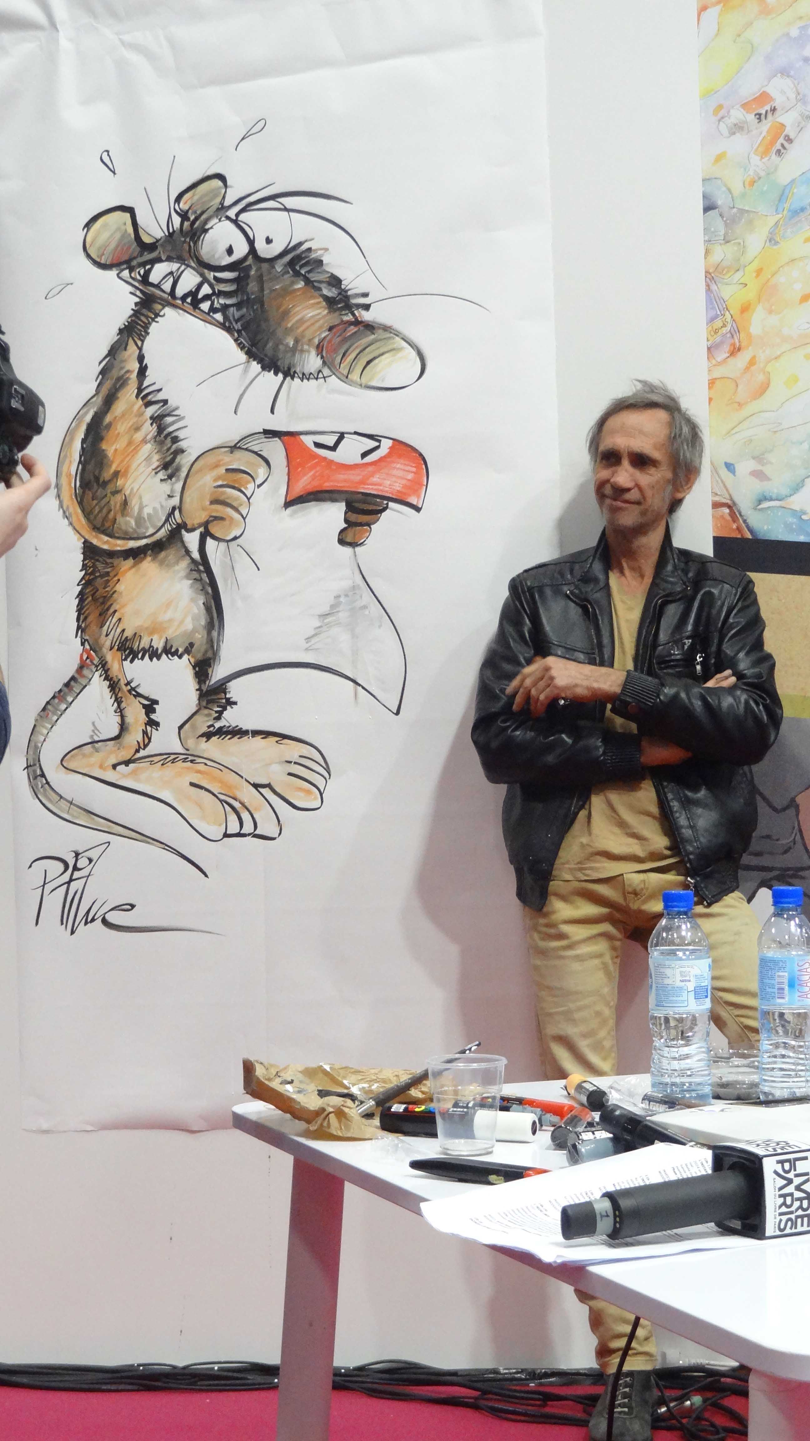 Ce fut l’occasion de découvrir, si vous ne le saviez pas, que Ptiluc est sorti de la décharge de Pacush blues pour travailler avec Bernard Swysen sur une BD relatant la vie de Hitler ! Rien que ça. La BD reste toujours animalière. Comme le dit l’auteur. « J’ai casté mon acteur préféré, le rat, et il convenait au rôle alors je l’ai engagé ! »