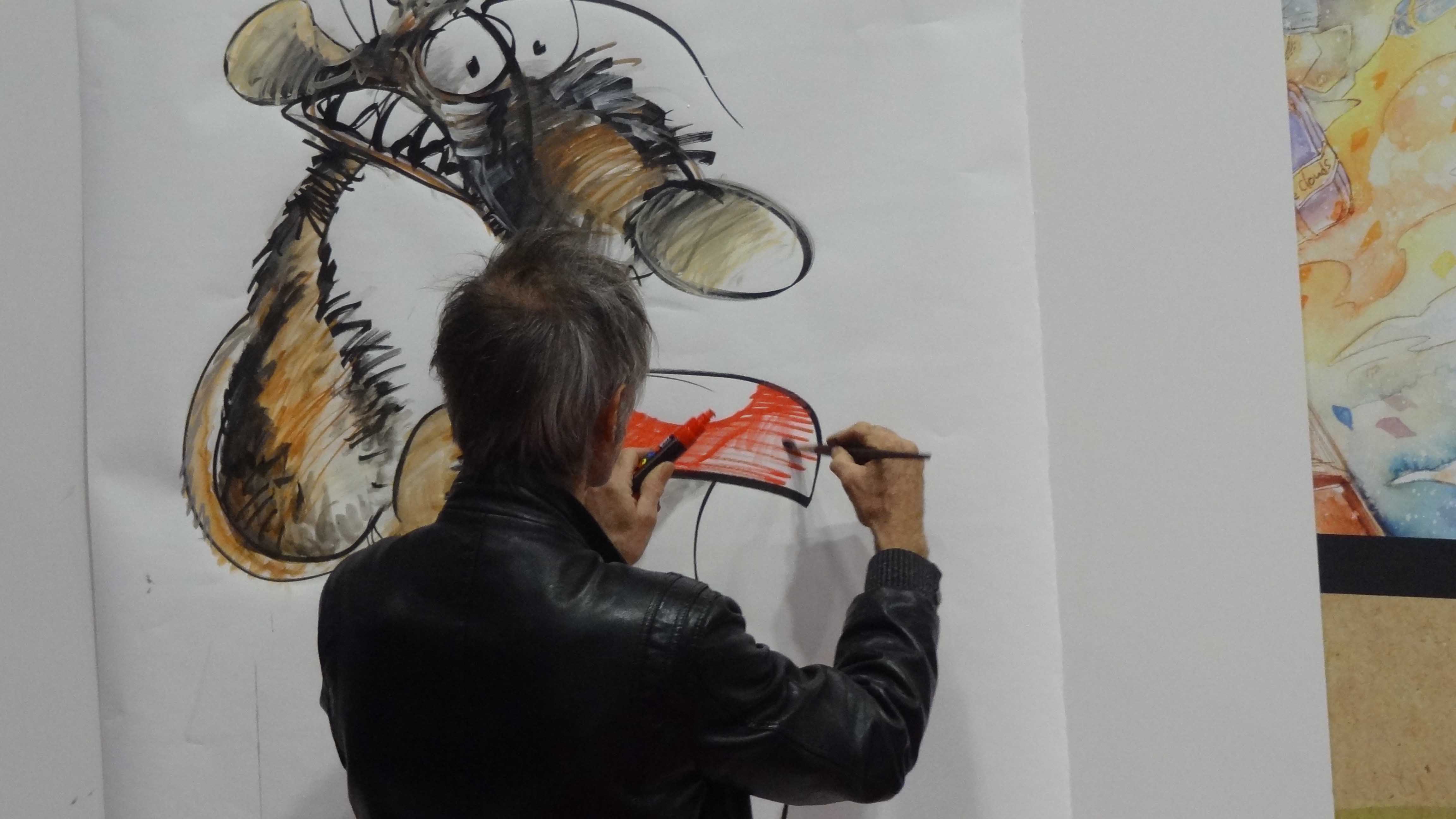 Notons que parfois, il s’arrête, car il est techniquement compliqué de parler dans le micro tendu sous votre nez pendant que vous dessinez sur le mur !