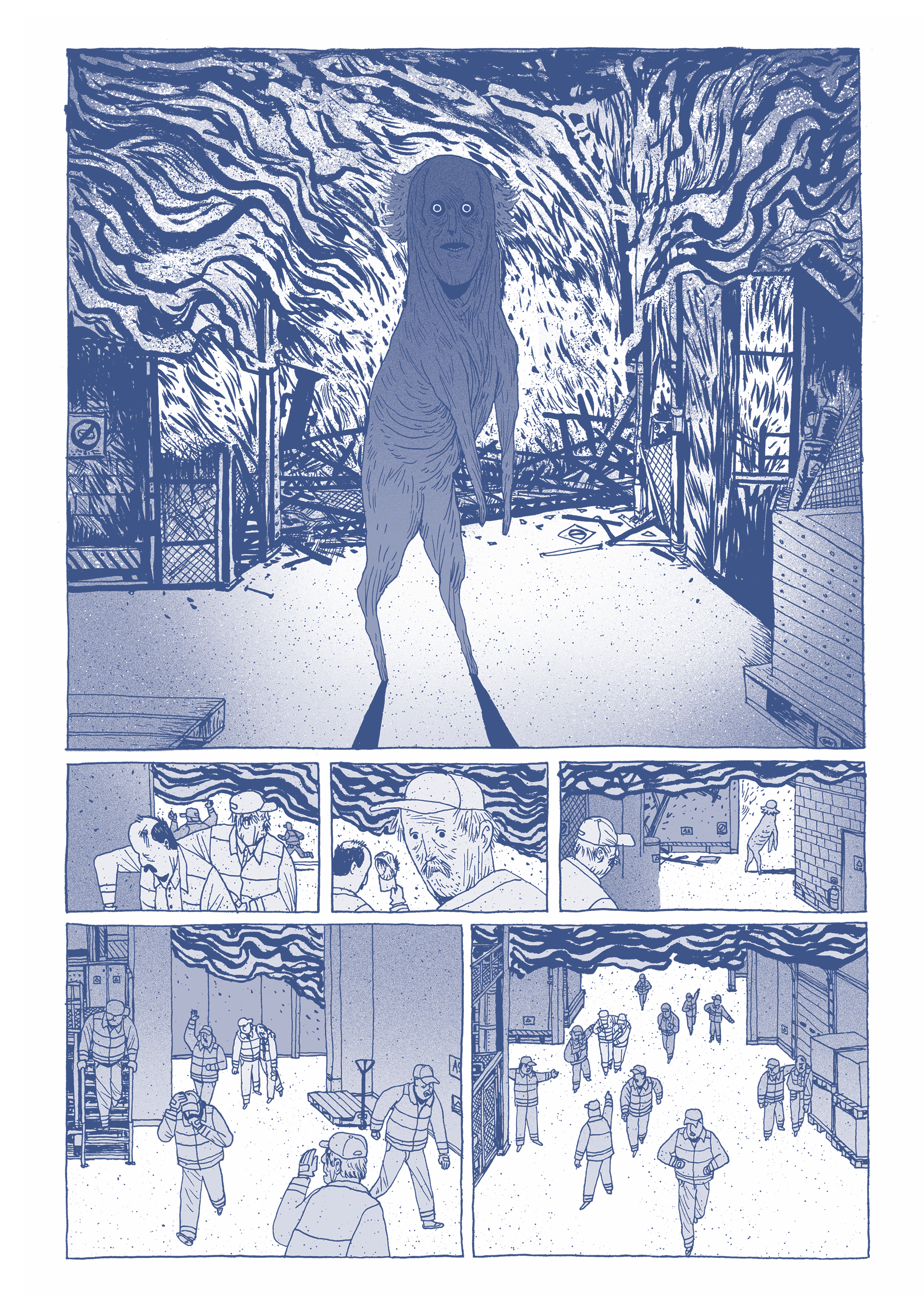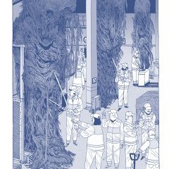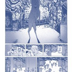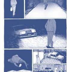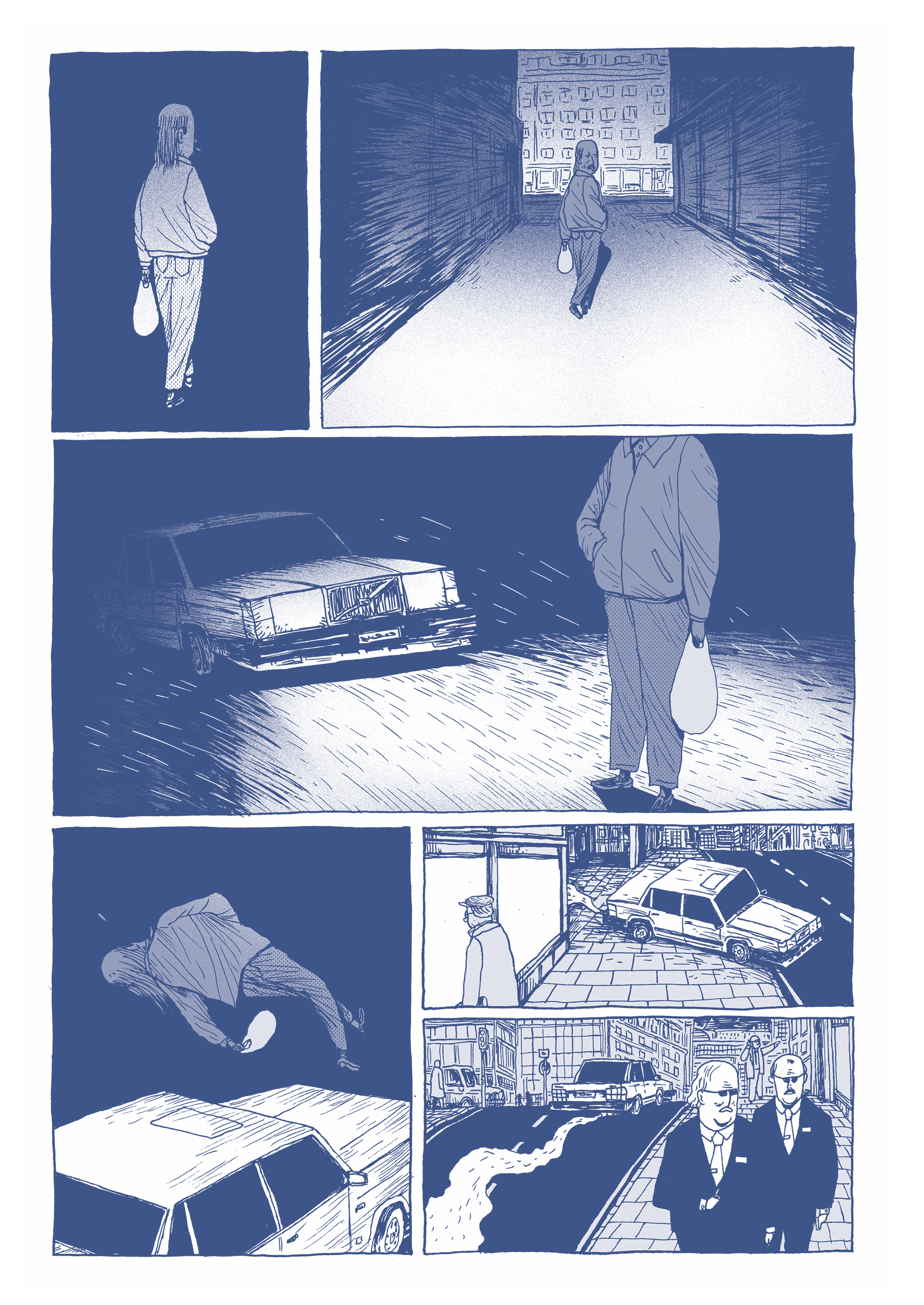 Une Volvo blanche repose par ailleurs sur des choix graphiques percutants : Erik Svetoft utilise une même teinte bleue pour l’ensemble de ses pages, et alterne entre des scènes dialoguées, des scènes d’actions et des représentations métaphoriques déroutantes. Le scénario perd parfois son lecteur, qui peine à distinguer tous les enjeux de l’enquête au milieu de dialogues absurdes et de personnages ubuesques, mais Une Volvo blanche se vit d’abord comme une expérience de lecture, aussi étrange semble-t-elle parfois. C’est en se laissant entraîner dans cette enquête qui perce – littéralement – les entrailles du capitalisme suédois que l’on comprend le sens de cette lecture qui en déroutera plus d’un.