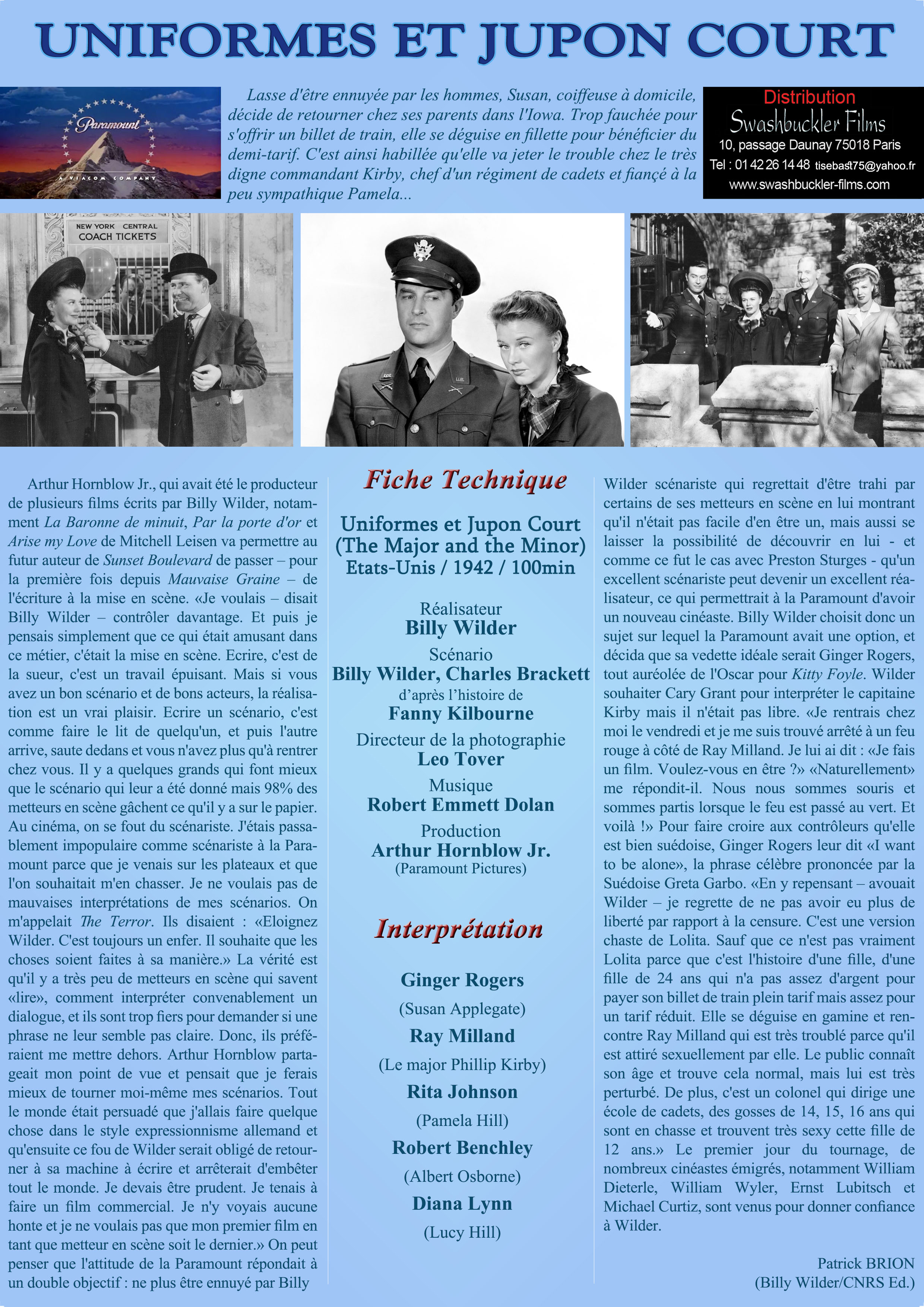Si cela ne donne pas la réussite la plus brillante de son auteur, Uniformes et jupons courts trouve une place plus qu’honorable dans sa filmographie. Dans ce récit alerte et plaisant, le cinéaste pose déjà tous les jalons de son œuvre à venir. : usurpation d’identité et déguisements, obsessions sexuelles (la pauvre héroïne doit sans cesse lutter contre les assauts d’hommes de tous âges), brillance des dialogues, ironie des situations... Le tout forme une excellente comédie truculente servie par de bons interprètes, Ginger Rogers et Ray Milland, très amusant en dadais galonné et manipulé (à des années lumières du terrible mari hitchcockien du Crime était presque parfait).
