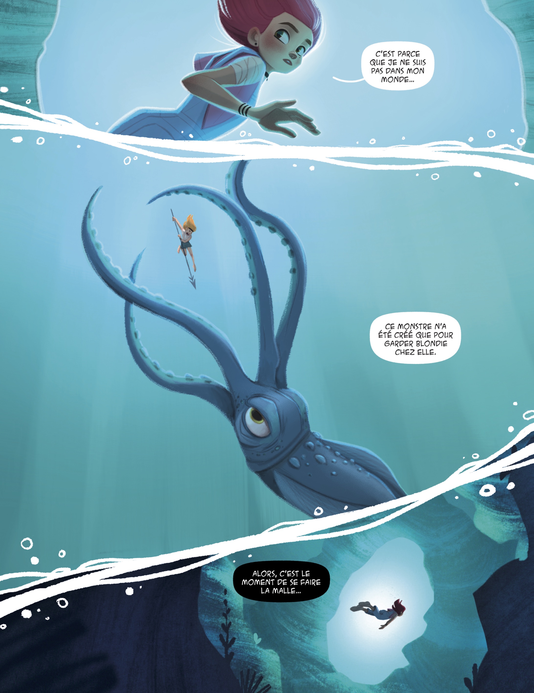 Le dessin d’Aveline Stokart continue de lier esthétique rétro et efficacité narrative en convoquant certains effets (flous, réduction de la profondeur de champ…) et cela est particulièrement adéquat et efficace dans cet album qui enchaîne les scènes de bravoure sur terre, sur et sous l’eau, mais également dans l’espace.