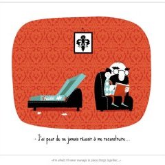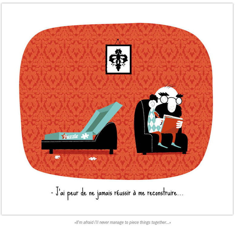 En fait c’est clairement une déclinaison. La première idée, je l’ai un peu comme ça... Un objet chez le psy et, après, c’est une déclinaison comme dans la publicité ou tu déclines un concept. Alors, j’imagine un mille pattes chez le psy et me demande quel peut être son problème... Et c’est toujours en partant comme ça. Ou, alors, au contraire, je pars de phrases classiques que l’on peut dire chez le psy comme "je ne sais pas si je vais réussir à me reconstruire" et me dit qui pourrait dire ça ? Qu’est-ce qui pourrait être marrant ? Réponse : Un puzzle !