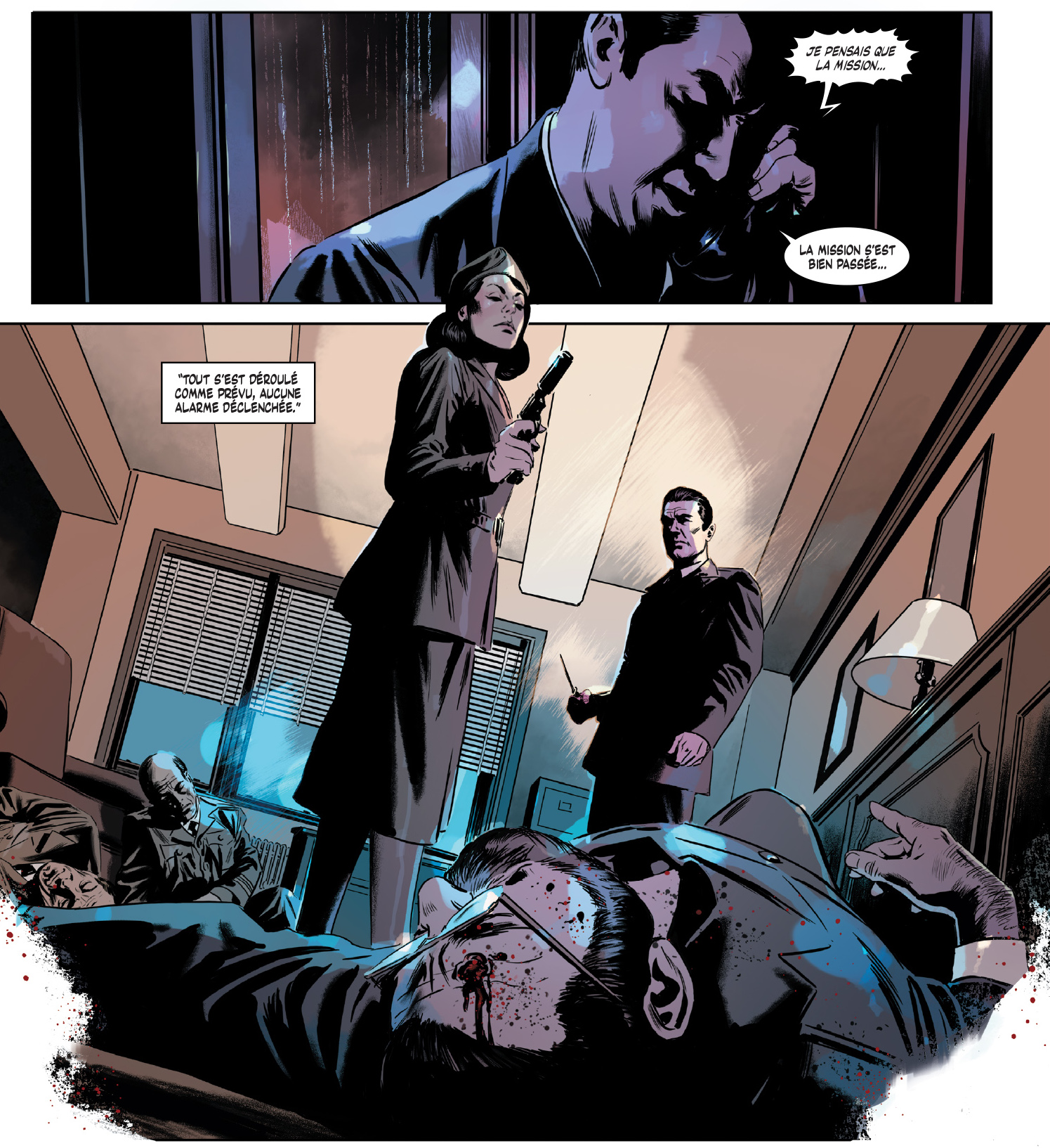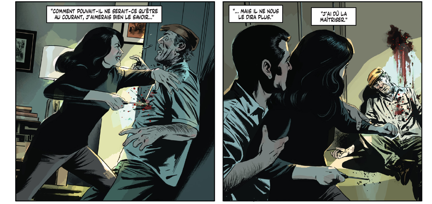 Le dessin et la mise en couleur, précis et sombres, voire charbonneux par moment, se révèle parfaitement adapté à l’ambiance, qui n’est pas franchement à la rigolade. En effet, ils sont loin, les agents débonnaires et cyniques campés par Sean Connery ou Roger Moore : dans Velvet , les espions sont tous névrosés, paranoïaques, incapables de se fier à qui que ce soit, une image sans doutes moins romantique, mais beaucoup plus proche de la réalité.