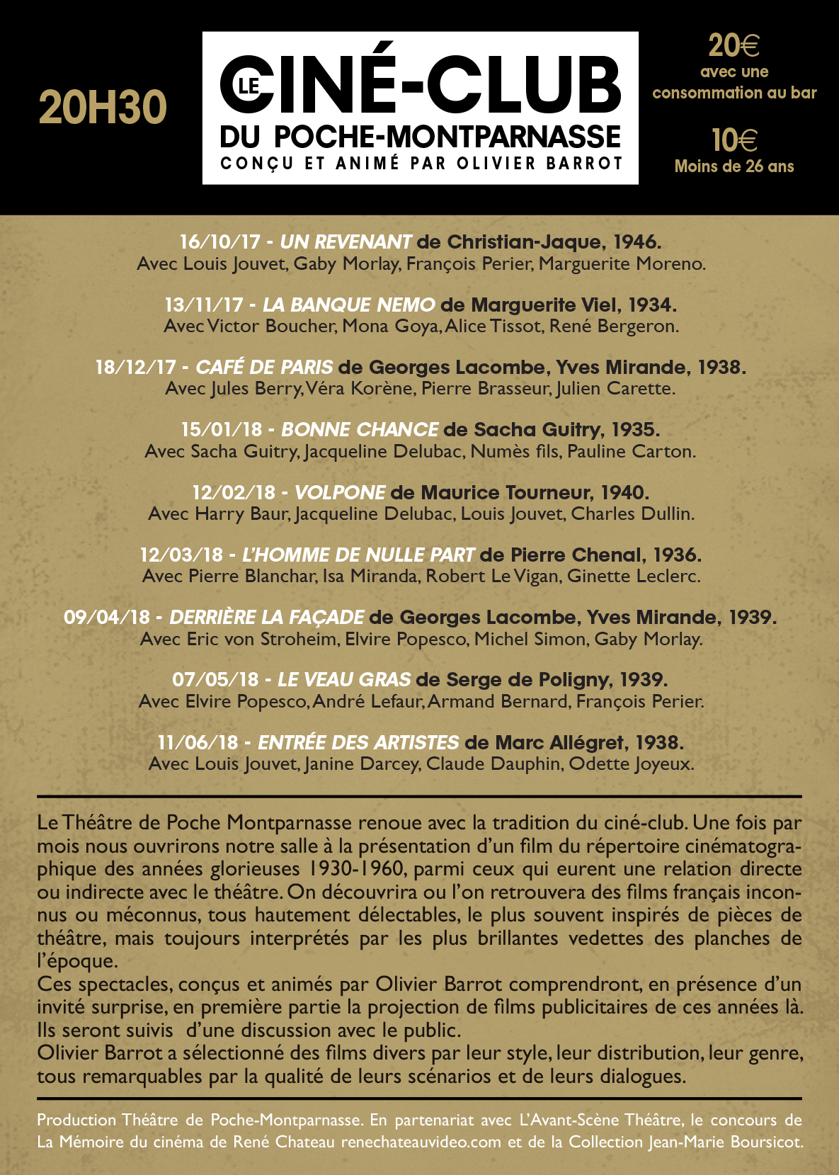 En cette rentrée 2017, Olivier Barrot, journaliste et présentateur, lance trois ciné-clubs dédiés au cinéma français selon la bonne vieille formule présentation/projection/discussion en programmation mensuelle un lundi par mois à 20h30. Des films à revoir, à découvrir autour du théâtre.