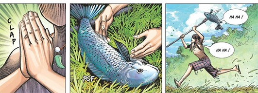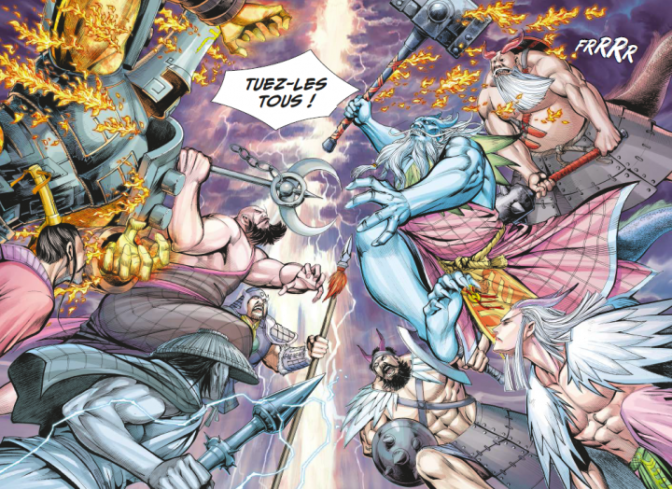 Graphiquement, c’est un beau condensé d’action que nous découvrons sous les pinceaux de Deng Zhihui. Le cadrage dynamique et certaines lignes de vitesse ne sont pas sans rappeler ceux du manga et l’influence est bien marquée. Mais Vers l’Ouest se démarque de ses contemporains Japonais ne fut-ce que par ses couleurs. Et oui, la chose importante à savoir est que cette BD regorge de couleurs. Alors ne vous dites pas « Ah, je connais le truc, couverture et une ou deux pages en couleur, comme les manga, et le reste en noir et blanc ». Perdu les amis ! Vous aurez TOUT en couleur. Et de belles couleurs claquantes, qui savent se marier avec ces lignes de vitesse, renforçant la dynamique dans l’action.