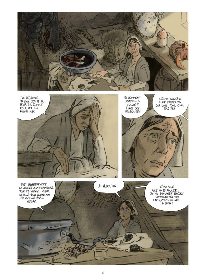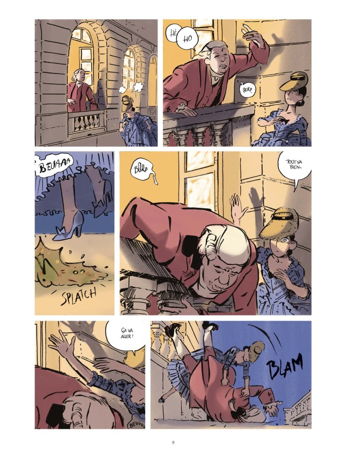Dans cette course effrénée et passionnante vers les sommets, c’est Clothilde Chauvin qui entraîne le lecteur à la suite de Célimène, celle qui de chiffonnière voudra s’élever jusqu’à duchesse, celle qui de la boue voudra l’or, quitte à tout risquer. Les personnages qui gravitent autour d’elle, sa mère et ce jeune talentueux mais sans ambition, permettent de mieux la cerner, la détester un peu, mais toujours en se disant qu’elle n’est finalement qu’un autre Rastignac ou Georges Duroy, comprenant cette ambition, jugeant ses excès, fustigeant l’ordre établi alors qu’elle ne cherche pas à le renverser, mais bien à le soumettre. Pour cela, le dessin se fait dur, sombre et pauvre, avant de monter en lumière et en décor, avant de montrer les jardins, les antichambres et les palais pour en faire une œuvre quasi historique.