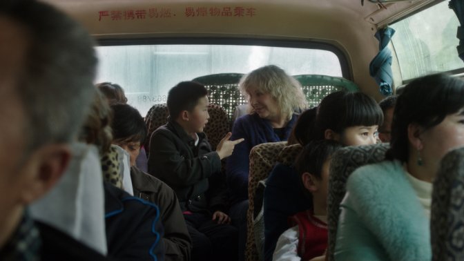 Un long périple commence. Le cinéaste nous invite à y prendre part à travers le pas décidé, mais aussi le regard hagard et parfois inquiet d’une Liliane à la crinière blonde et grise, emmitouflée dans un grand manteau rouge. À tout moment notre héroïne doit faire face aux difficultés d’une voyageuse peu expérimentée, obligée de baragouiner un anglais rudimentaire et d’écarquiller ses beaux yeux bleus pour appeler à l’aide. Pas évident en effet de se repérer dans un Shanghaï démesuré et de trouver la destination de Langzong, grande vieille ville traditionnelle du Sichuan où a vécu son fils.