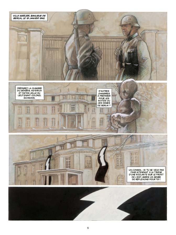 La BD peut-elle avoir une rôle de document historique, comme peut l’être la vidéo par exemple ? Un reportage, qui reprendrait des photographies, des extraits de documents officiels. Voilà comment se présente Wannsee, documentaire d’un nouveau genre, proche de Shoah de Lanzmann par certains aspects, avec une exactitude qui se veut témoignage, empreinte, trace. Car il y a quelque chose de terrifiant à l’idée que les prochaines générations pourraient mettre de côté, diluer ou oublier l’ignominie que fut cette décision, où de simples gratte-papiers ont pu orchestrer de façon technocratique et politique, sans brutalité mais avec l’unique souci d’efficacité, la mort de tant de milliers d’âmes. Avec ses détails sur le gouvernement du Reich et sur ses rivalités, la répression des territoires occupés ou annexés, les débuts des einzastgruppen en Europe de l’Est, ces commandos qui ont entamé ce gigantesque charnier par des balles dans la nuque jusqu’aux camions au gaz d’échappement bouché, Wannsee est à la fois le commencement et l’apogée de ce que l’homme représente de plus détestable, haineux, vil et froid. Auschwitz n’en sera finalement que l’avatar.
