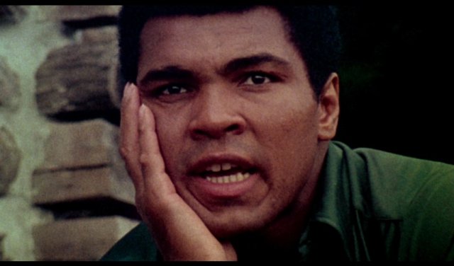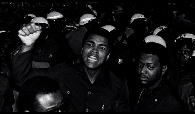 Même celles et ceux qui n’ont aucune idée qui fut Mohamed Ali ne peuvent s’empêcher d’être happés par son extraordinaire présence charismatique. Dès les premiers plans du film, nous sommes captifs, follement charmés. Bien plus qu’un sportif de haut niveau, bien plus qu’un boxeur sacré, c’est une personnalité hors du commun, où sa prose, entre faconde et bravache, n’en est pas moins nouée intrinsèquement à l’obligation quasi existentielle de se faire voir, entendre et surtout comprendre. Le combat pour son existence se niche totalement dans sa langue, une langue chantée, scandée, parfois psalmodiée, où le rythme relève du chant comme de l’incantation. Mais de quelle incantation s’agit-il exactement ? Le plus troublant aussi, c’est de constater la fragilité de cet homme, malgré sa séduction qui emporte tout le monde. Il est agité, bondissant autant par le corps que par la parole, et nous le suivons dans cette première rencontre sur la terre africaine. Ce qui importe n’est pas tant le match, toujours évoqué mais comme un horizon lointain, tel un désir suspendu, que les préparatifs et coulisses de cet évènement plusieurs fois annoncé. L’écrivain et scénariste Norman Mailer, tel un conteur lucide et néanmoins toujours admiratif, nous raconte le parcours de Mohamed Ali, depuis New York jusqu’à Kinshasa, tout comme sa détermination à lutter contre la toxicomanie des jeunes Noirs américains, jusqu’à son engagement aux côtés des Blacks Muslims. Le suspense monte, accrochés que nous sommes à ce qui nous est déroulé, telle une aventure sportive, politique et spirituelle.