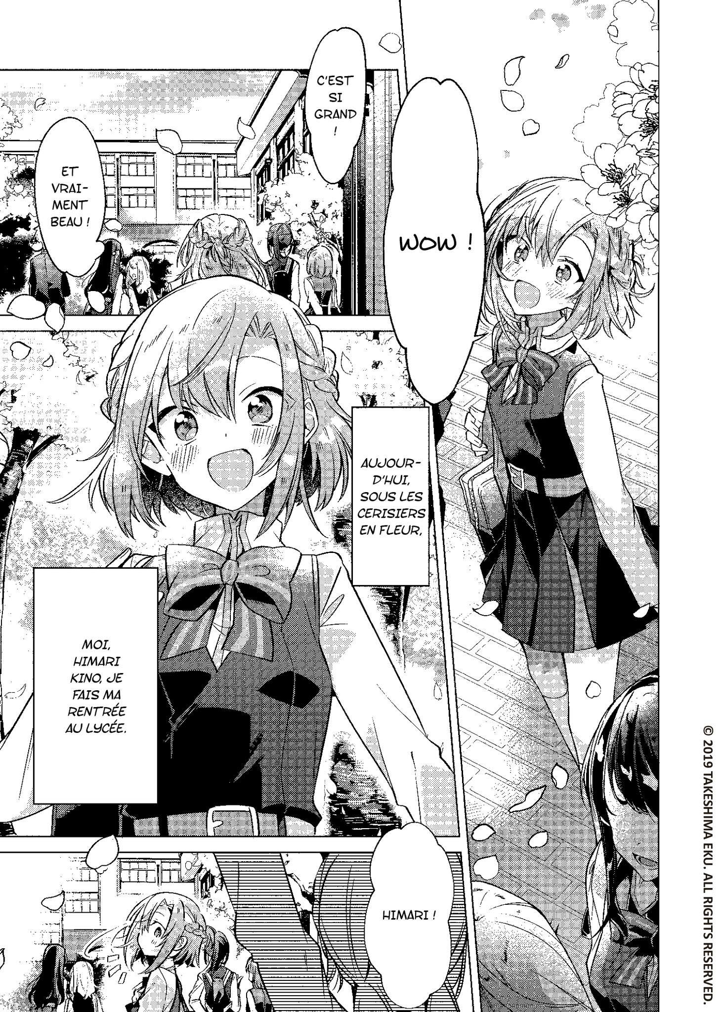 Eku Takeshima scénarise et dessine ce manga et nous offre une histoire Yuri qui se glisse tout doucement dans les codes des romances lycéennes, en mettant en scène deux jeunes filles réunies par un quiproquo...