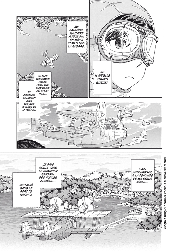 Résumé : {Winged Mermaids}, la nouvelle série courte, puisqu’elle est prévue sur trois tomes, de Etorouji Shiono, nous plonge dans un monde fictif, la Ligue des douze royaumes de Remzea. La technologie est avancée mais pas autant que chez nous car ces populations ont récemment découvert les avions. L’un de ces royaumes, l’île d’Aizen, est en guerre avec le continent de Yggländ. Vous l’avez compris, batailles aériennes au programme avec un couple de héros frère et sœur, Ishito et Misuzu Suzuki et un bataillon d’apprenties pilotes.