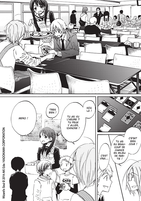 Wizard’s Soul nous plonge dans l’univers de Manaka. A côté de ses études, la jeune fille travaille dans un magasin de cartes à jouer nommé Draw et se trouve donc au cœur de l’univers Wizard’s Soul. Un patron sympa, des clients de tous âges toujours souriants, et le bel Eita qui lui fait du gringue, que pourrait-on demander de plus ? Tout simplement un père qui ne joue pas son argent et celui de la famille aux cartes (toujours Wizard’s soul et non le classique poker de 52 cartes) et une mère encore en vie, dont le souvenir hante Manaka. Manaka va devoir trouver une solution pour rembourser les dettes de son père et il n’y en a qu’une à ses yeux : participer au tournoi de Wizard’s Soul et surtout, gagner ! Mais pour cela, il faut s’inscrire.