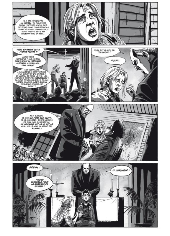 Les loups-garous changent en effet beaucoup de choses. Ce sont des hommes, avec leur esprit d’homme, seulement ils n’hésitent pas à renoncer à la compassion et ce qui les rattachent au reste de l’humanité. Ils écoutent leurs instincts de formidables chasseurs. Cela en fait d’impitoyables ennemis capables de s’infiltrer au milieu du reste des hommes. C’est d’ailleurs ce qui leur a permis de proliférer aussi facilement : un seul loup-garou dans une ville et en quelques mois la moitié de la population est contaminée. Parce que bien sûr ils sont contagieux, comme si les choses ne suffisaient déjà pas ! On n’est pas sans penser à 30 jours de nuits en lisant ce premier tome. Ce récit illustre littéralement l’expression du philosophe Hobbes : « L’homme est un loup pour l’homme ».