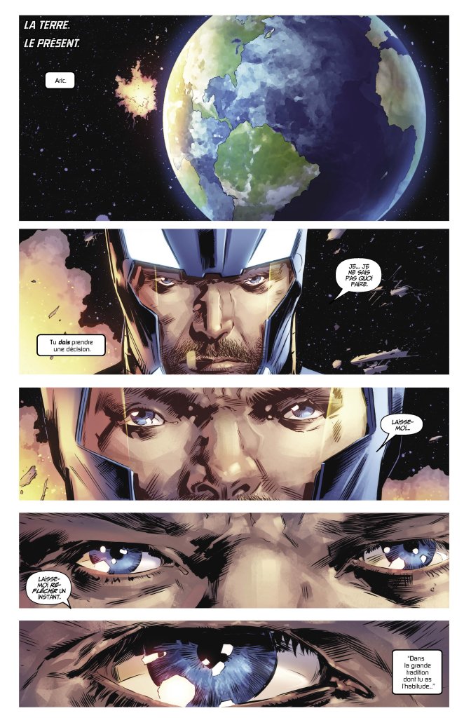 Matt Kindt a commencé sa trilogie en éloignant X-O Manowar de la Terre pour le soumettre au défi de conquérir une nouvelle planète, Gorin. Pour achever son run, le talentueux scénariste ramène le héros emblématique de l’univers Valiant sur la planète bleue. Les premiers chapitres se focalisent sur le passé wisigoth d’Aric de Dacie, qui effectue un parallèle entre le modèle assimilationniste de l’empire romain et celui des États-Unis, terre d’accueil des survivants wisigoths autrefois victimes des captures d’extraterrestres. Le présent se rappelle toutefois rapidement à X-O Manowar, confronté à de dangereux chasseurs de prime : ces confrontations offrent une nouvelle intensité au récit marqué par des retrouvailles et le retour au sources.
