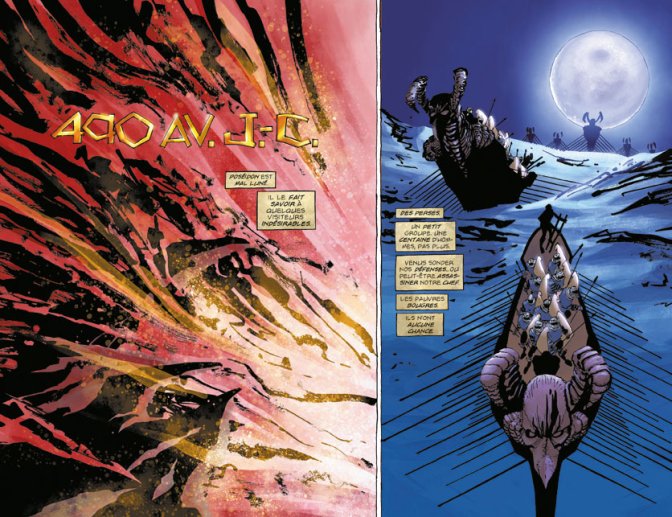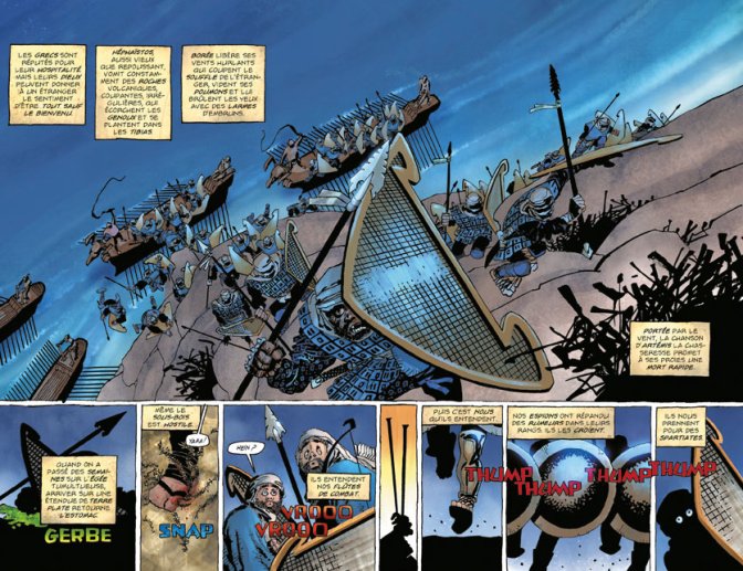 Le récit, couvrant donc plus de cent ans de guerre, avance énormément par ellipse, ce qui est normal. Il joue parfois sur ces ellipses de manière bien pensée, évoquant par la narration ce qu’on s’attendait à découvrir en image. Mais parfois, nous avons eu l’impression que le récit s’étirait en longueur faute de moments forts. Comme si un ventre mou s’imposait dans l’histoire au temps de Darius et Alexandre, ou de la fin de Xerxès.