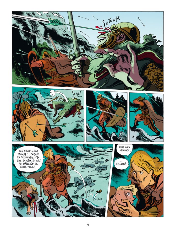Il y a de la légende, du mythe, du conte et de la parabole dans cet album d’Ys, nom d’une ville, d’un espoir, d’un fragment de société et d’utopie. Rêve d’une femme de pouvoir indépendante, cette histoire mêle d’une manière originale soucis magiques et économiques, desseins religieuses et politiques. Les difficultés sociales et les revers économiques paraissent étrangement moins vrais que les miracles et les remèdes sacrés qui sont les solutions. De fait, les élans eschatologiques des ermites ou des saints côtoient les forces ancestrales païennes, après une première partie où les années et les péripéties ont défilé à une vitesse accélérée, le tout sans vraie magie. L’essor du christianisme est ainsi tissé à travers une toile métaphorique à la fois acerbe et conquérante, où l’on voit la culpabilité s’asseoir sur les mœurs et le quotidien des gens, lentement mais sûrement, comme dans l’Histoire, la vraie. Rien que pour ce sentiment désagréable, sourd et tenace, que le déroulement de l’histoire (la fictionnelle) procure, à travers la modification du caractère des personnages, Ys est une totale réussite. Sorte de pamphlet moderne, parabole bien amenée qui n’a rien à envier aux Troglodytes d’un Montesquieu ou les autodafés d’un Voltaire, c’est davantage qu’un scénario qui se dessine, c’est un message qui est passé, une flamme portée, alliant le mythe et le mysticisme.