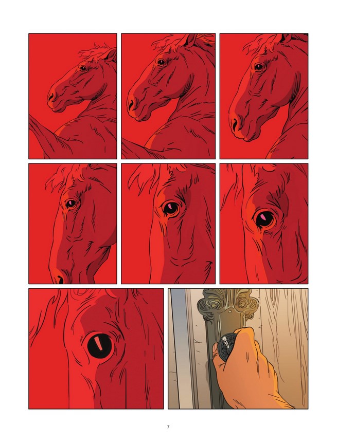 Les couleurs de Delphine apportent l’ambiance de ces nuits londoniennes, les éclairages des phares, et ce rouge sang au service des scènes oniriques et mystérieuses. La composition aérée permet de laisser l’espace à des cases où les personnages peuvent agir, l’action se développer et les silences, plus éloquents que les mots grâce aux regards des personnages, s’imposer. À côté de cela, onomatopées, lignes de vitesse, nuages de fumée, autant d’éléments qui permettent d’accentuer encore le mouvement que l’histoire insuffle dans chaque page.