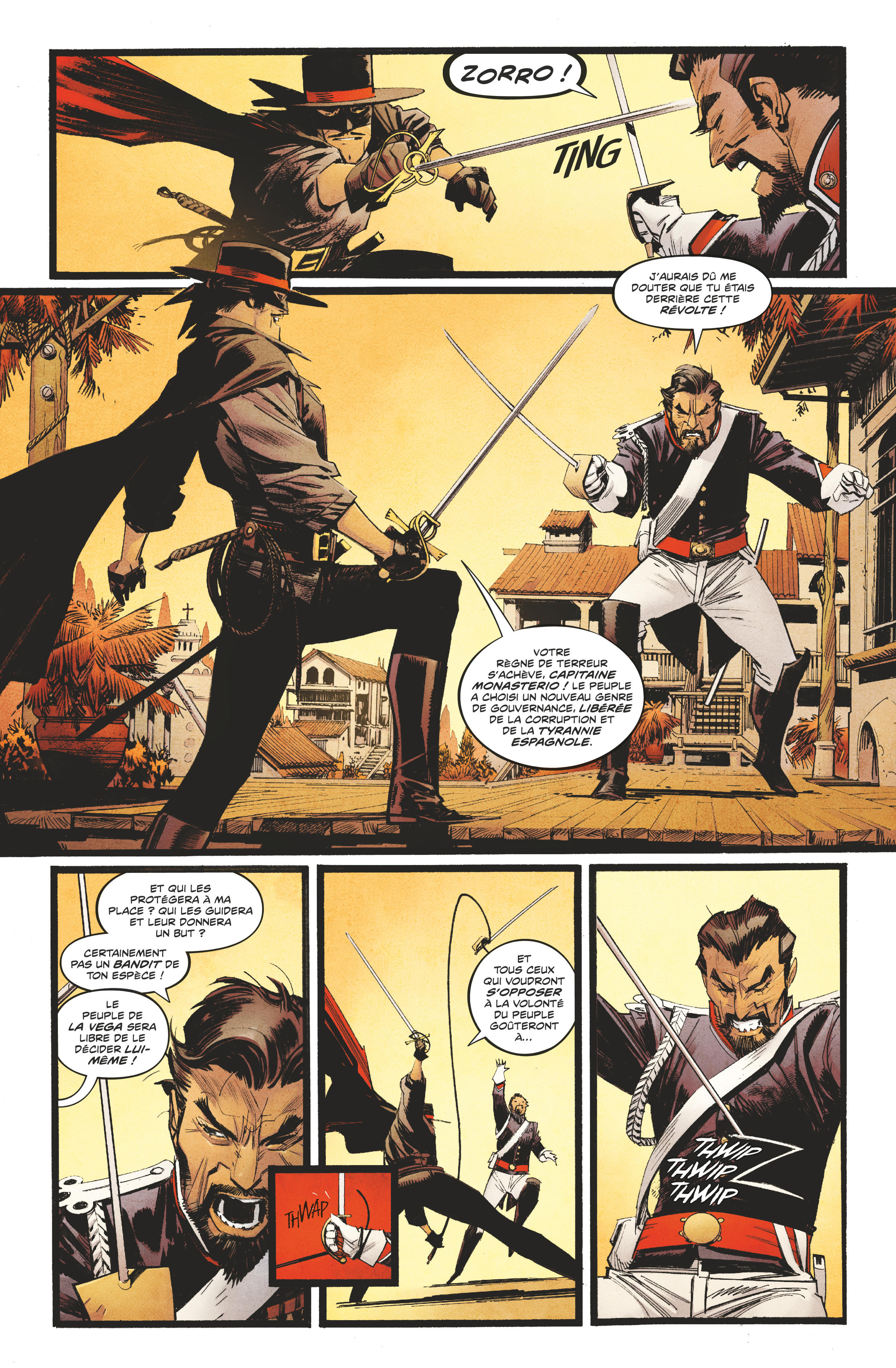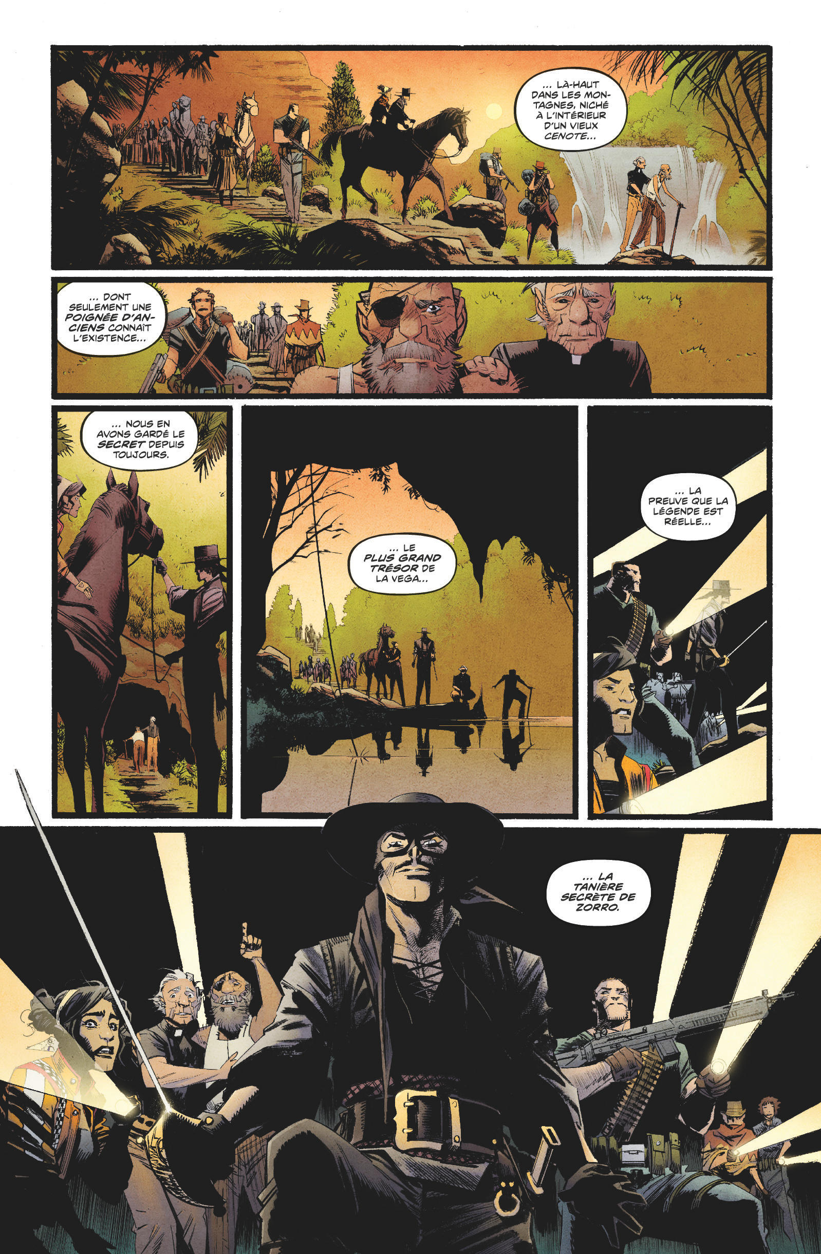 Résumé : Dans la ville de La Vega, au Mexique, Zorro est un mythe célébré par la population lors des festivités del Dia de lors Muertos. Le héros masqué aurait, voilà 180 ans, sauvé la vallée de la tyrannie espagnole. Mais cette figure émancipatrice n’est guère appréciée des cartels de la drogue, et notamment celui dirigé par le terrible El Rojo qui règne en maître sur la vallée. Le jour des célébrations, El Rojo met fin au spectacle qui met en scène Zorro en assassinant l’acteur qui jouait le personnage face à toute la population. Vingt ans plus tard, ses deux enfants, Rosa et Diego, ont adopté des chemins opposés : elle a rejoint le chemin du cartel, quand le jeune homme semble encore vivre dans les rêves du justicier masqué… Pourtant, à l’heure où le cartel est plus violent que jamais, il semblerait que l’heure de la vengeance ait sonné.